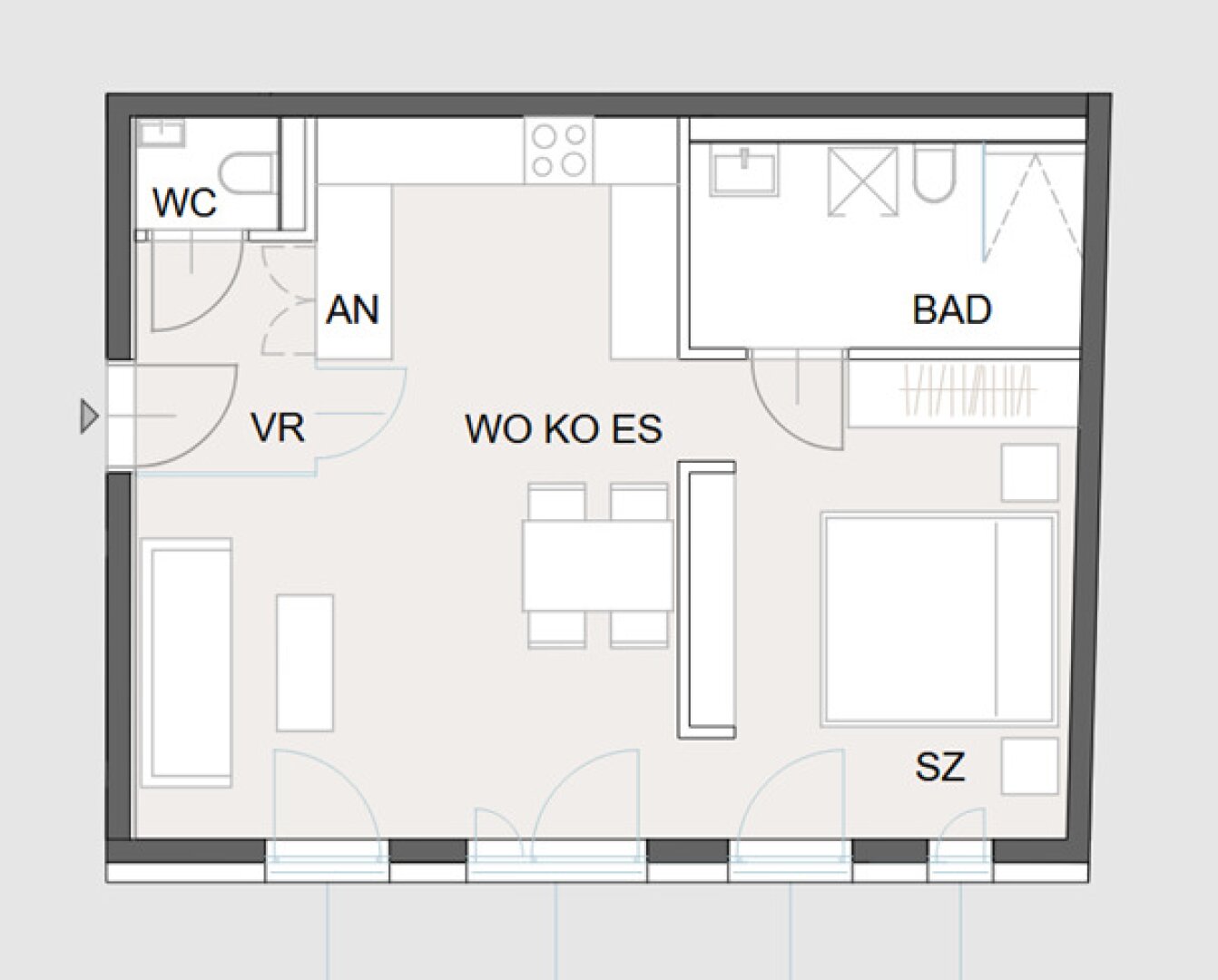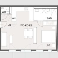 Vorzimmer, Wohn-Esszimmer mit offener Küche, Schlafzimmer, Badezimmer mit WC, separates WC und Kellerabteil