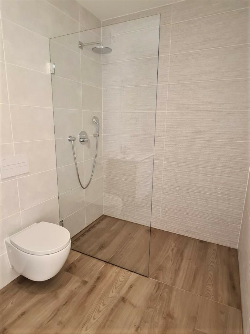 - Badezimmer mit Dusche, Waschtisch und Waschmaschinenanschluss