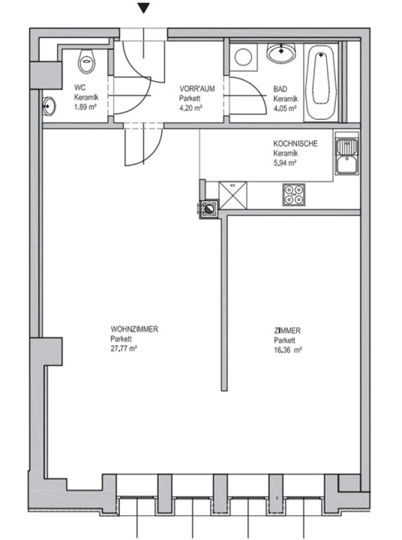 Vorzimmer, Wohn-Esszimmer mit Kochnische, Schlafzimmer, Badezimmer, separates WC und Kellerabteil