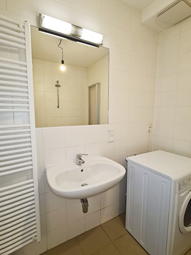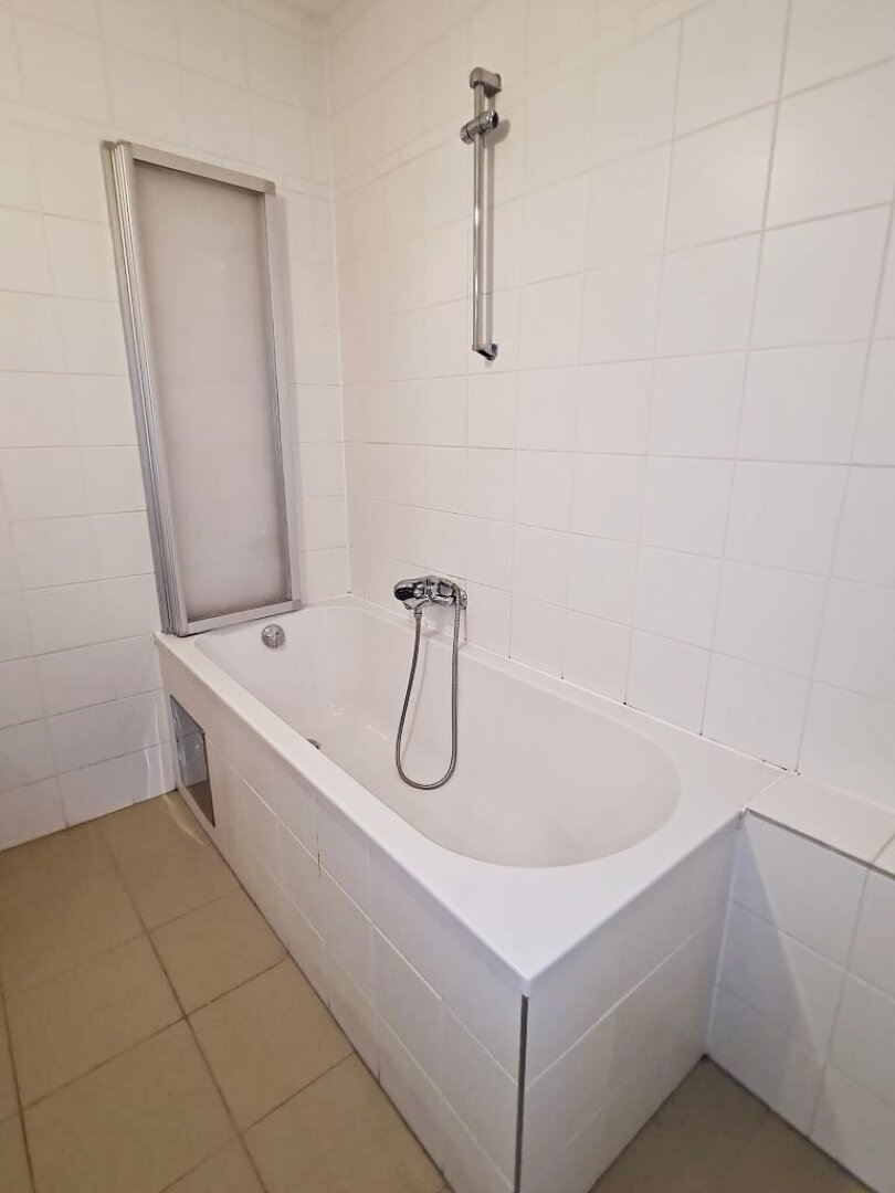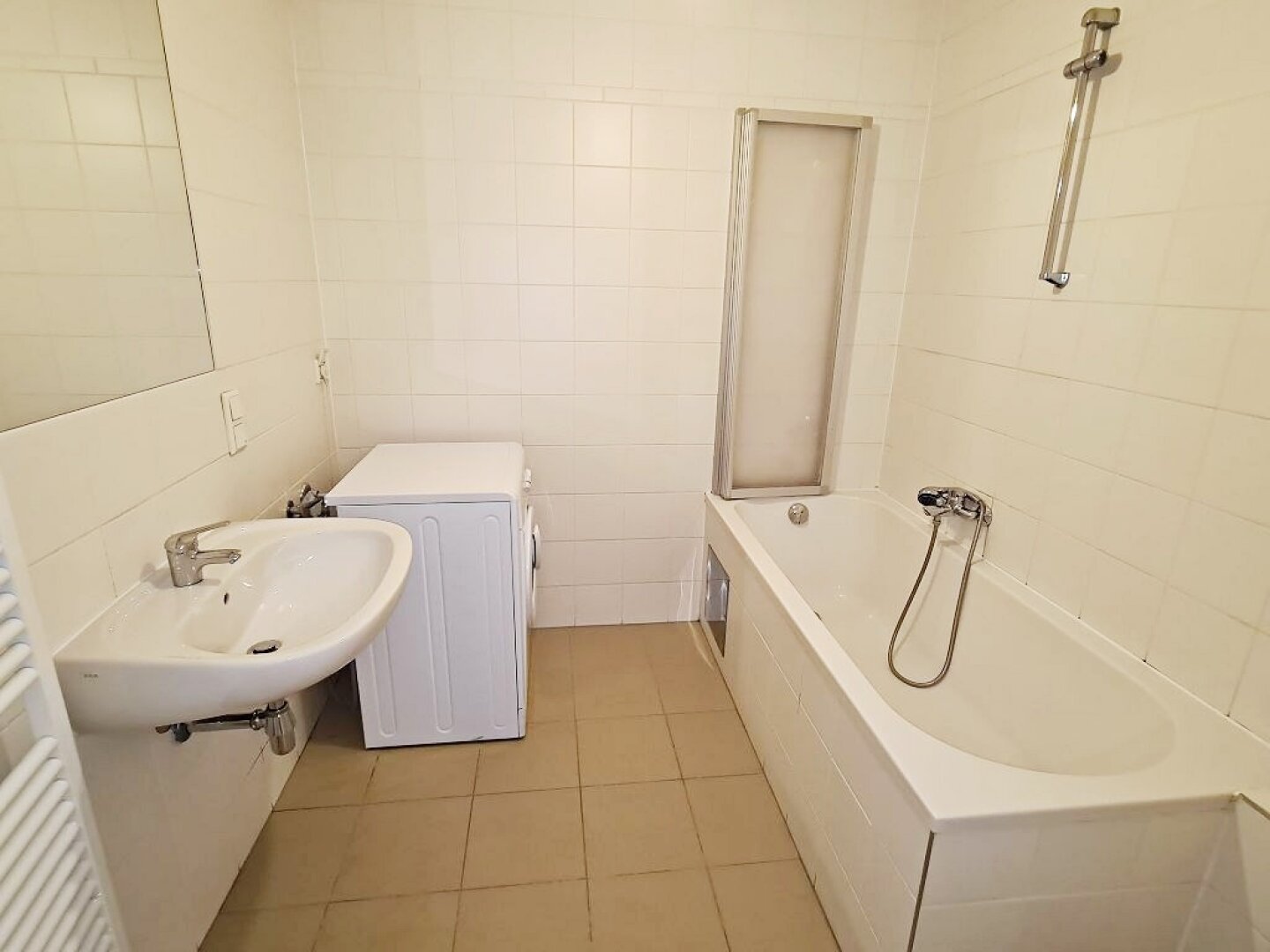 + Badezimmer mit Badewanne, Waschtisch und Waschmaschinenanschluss