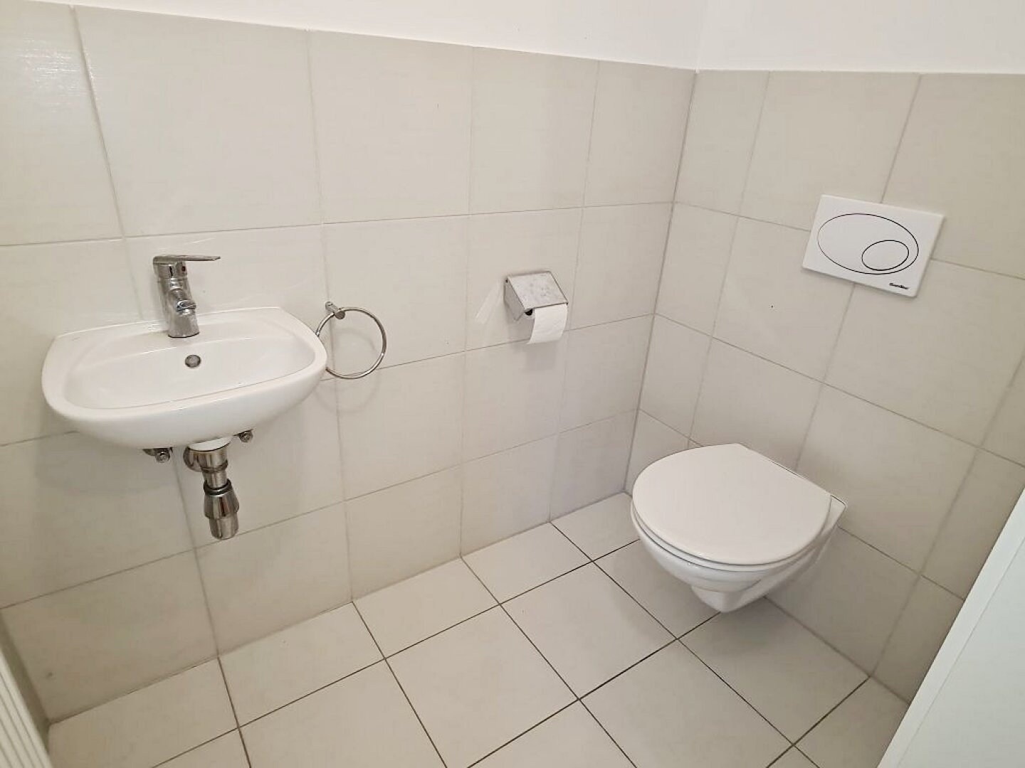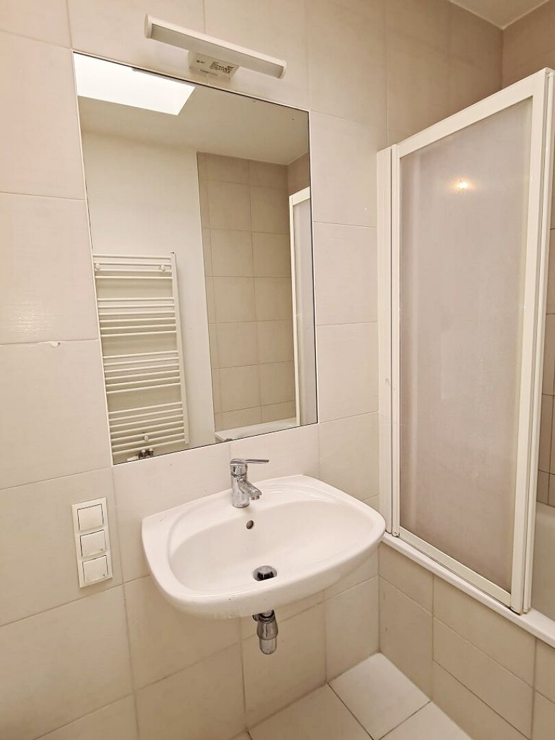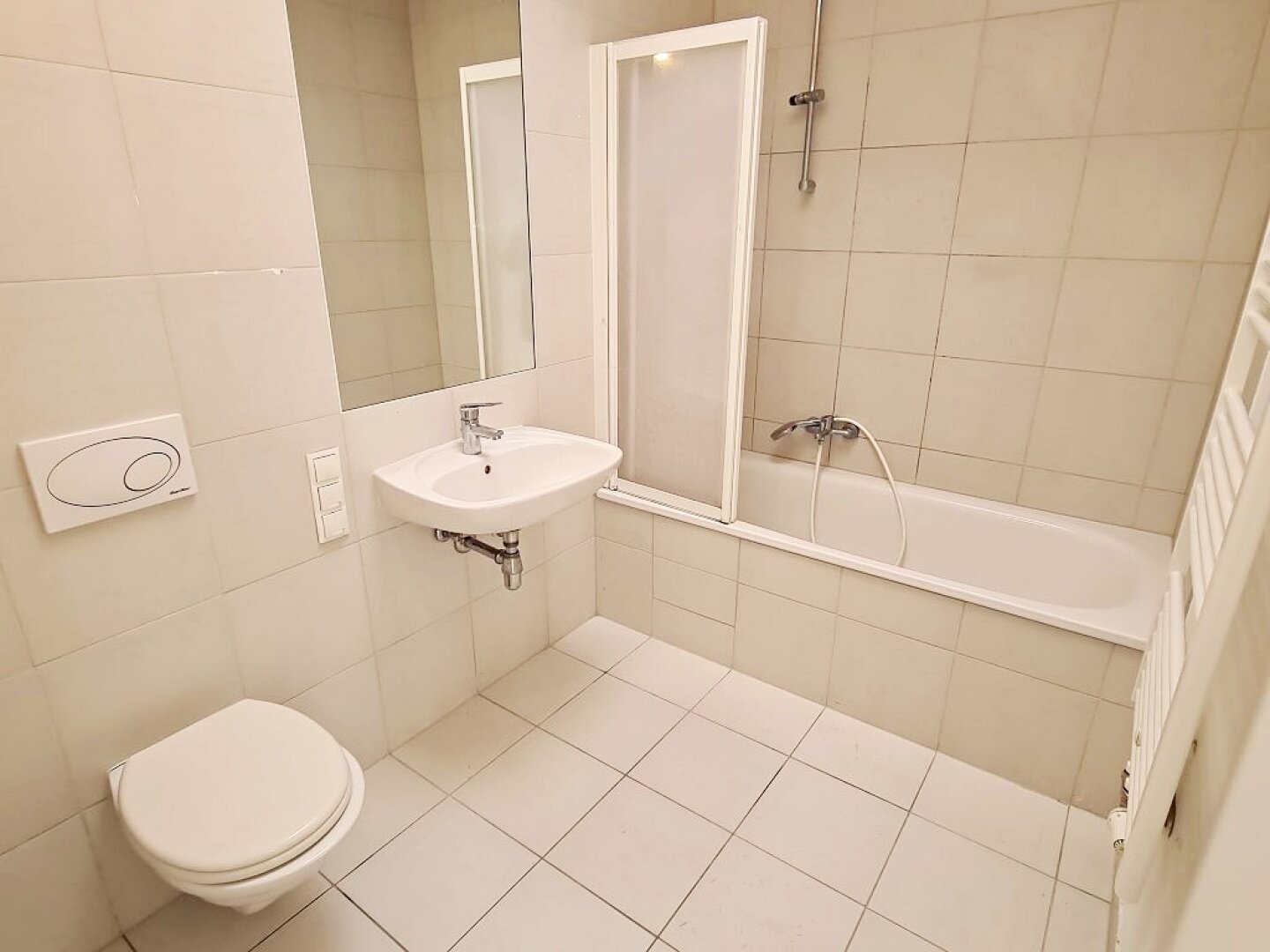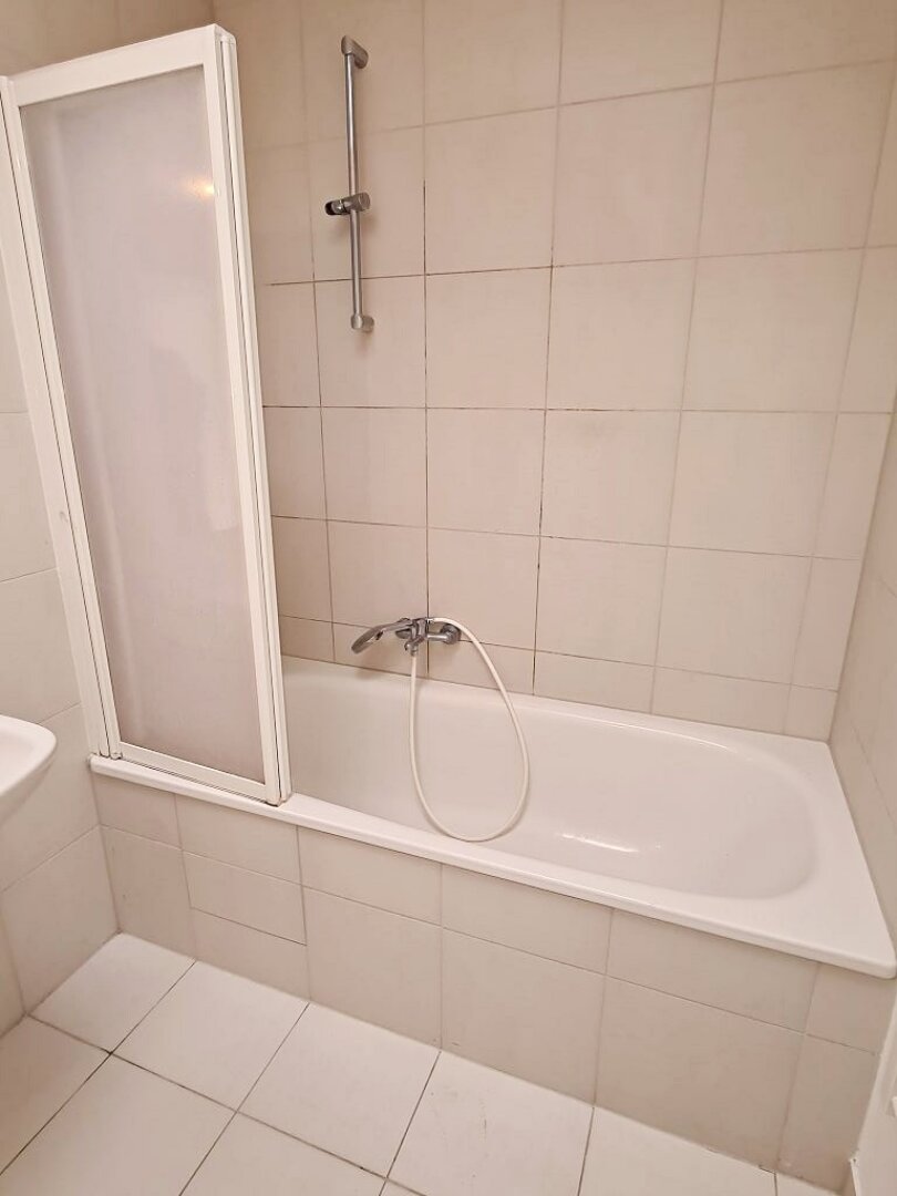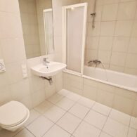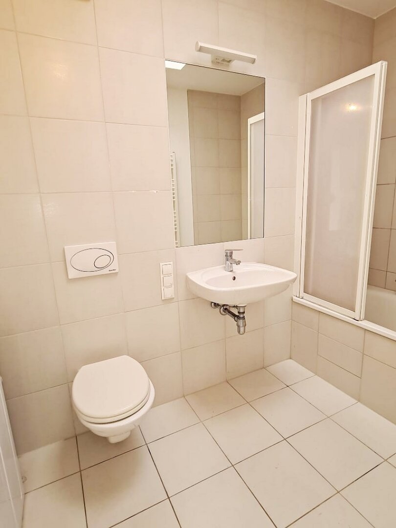 + Badezimmer mit Badewanne, Waschtisch, WC und Waschmaschinenanschluss