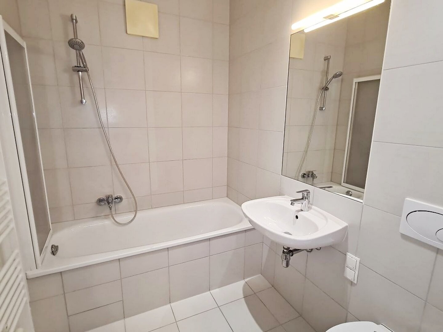 + Badezimmer mit Badewanne, Waschtisch, WC und Waschmaschinenanschluss