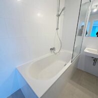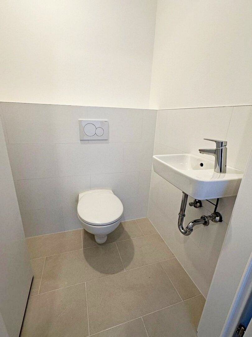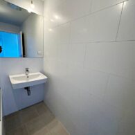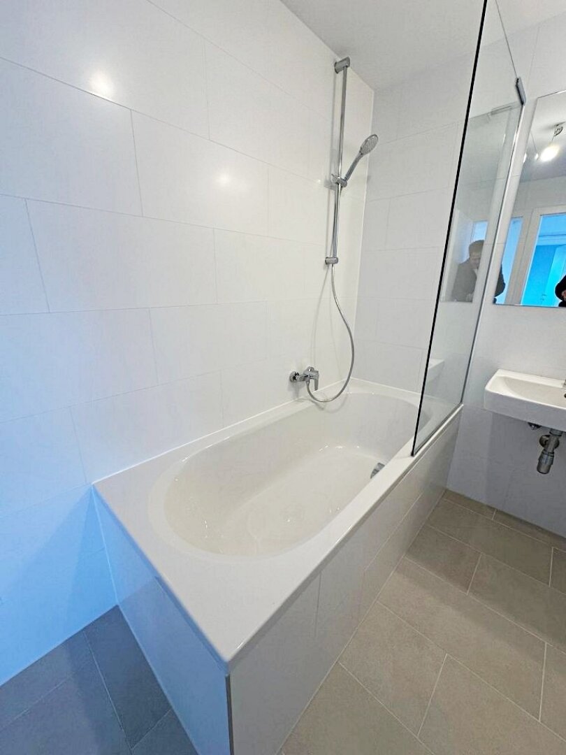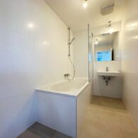 + Badezimmer mit Dusche, Waschtisch und Waschmaschinenanschluss