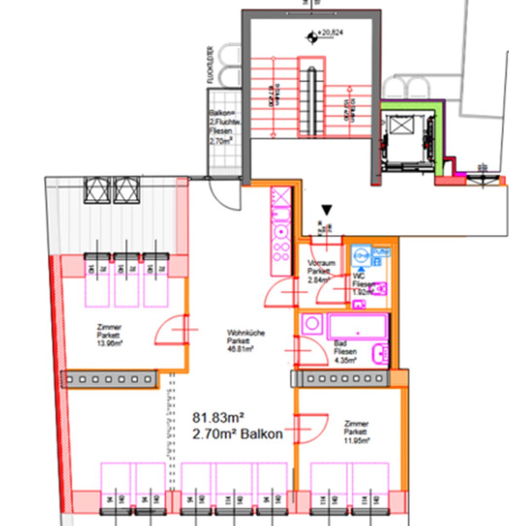 ERSTBEZUG, DACHGESCHOSS, klimatisierte 82 m2 Neubau mit Balkon, Wohnküche, 2 Zimmer, Wannenbad, Parketten, Augarten