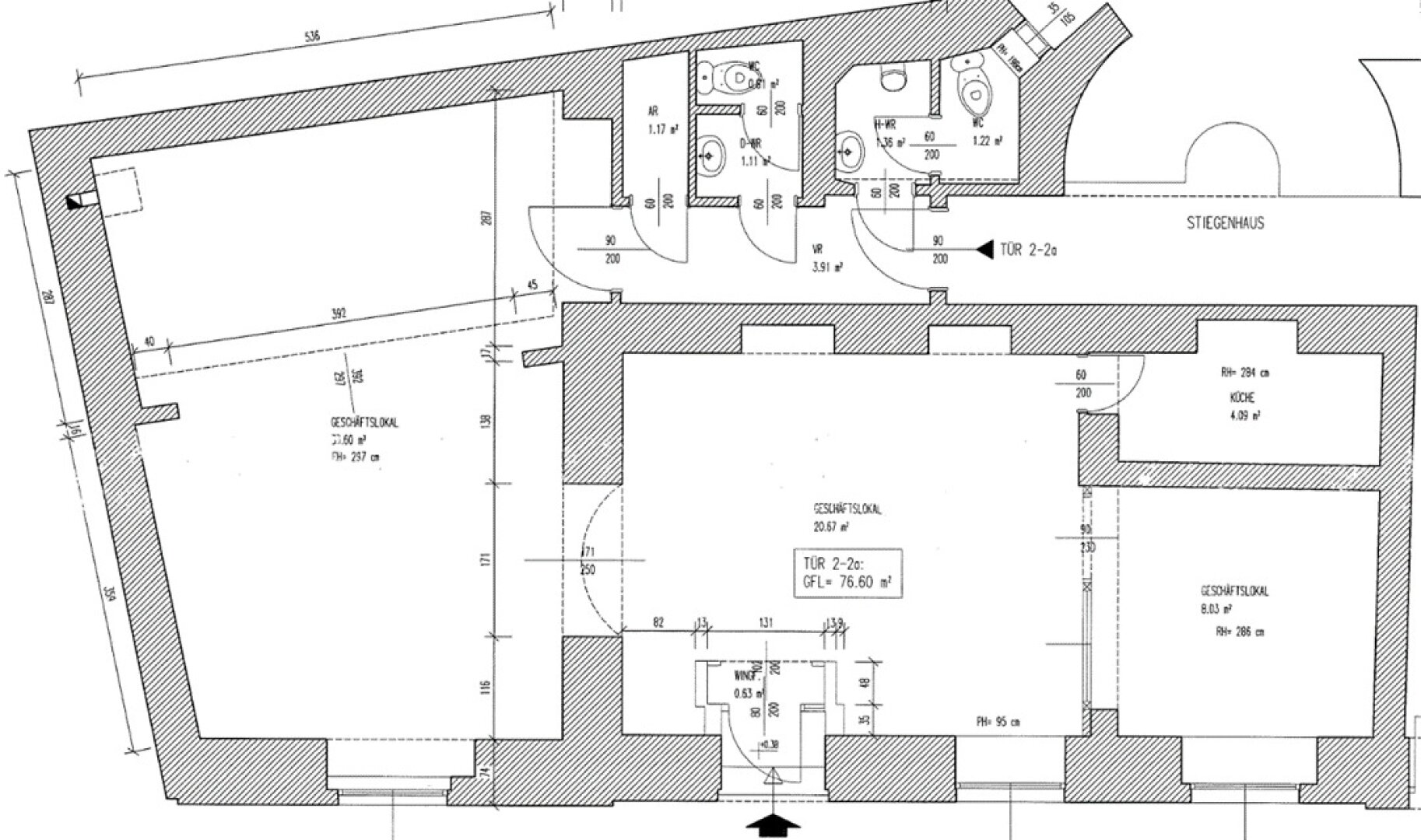 GROSSE MOHRENGASSE, straßenseitiges 77 m2 Geschäftslokal, 3 Zimmer, Nebenräume, Edelrohbau