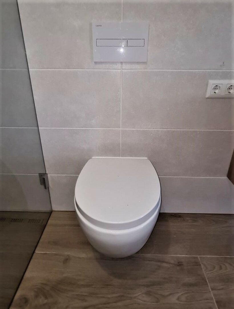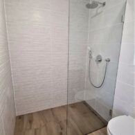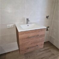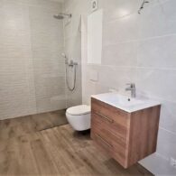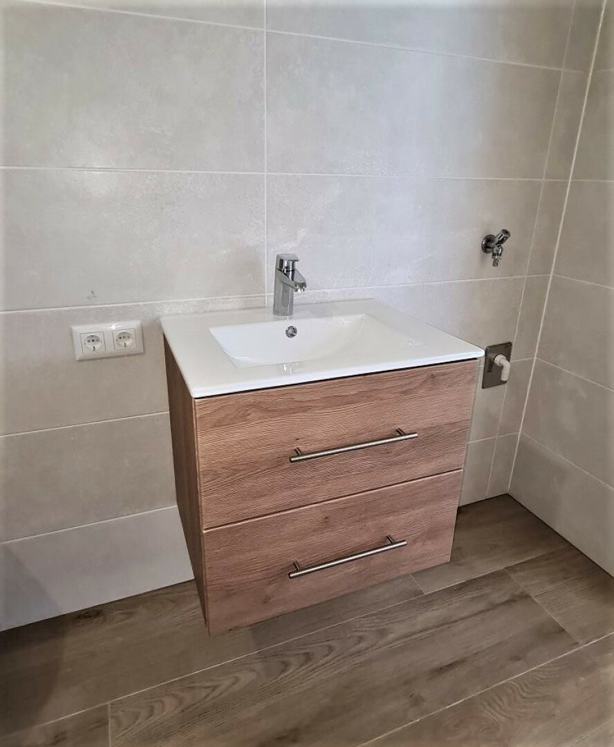 - Badezimmer mit Dusche, Waschtisch, WC und Waschmaschinenanschluss