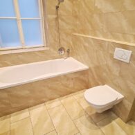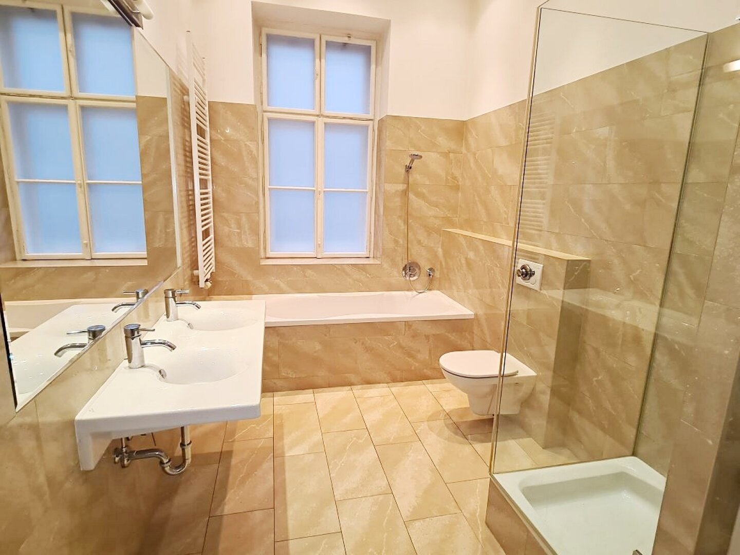 + Badezimmer mit Badewanne, Dusche, Doppelwaschtisch, Sprossenheizkörper und WC
