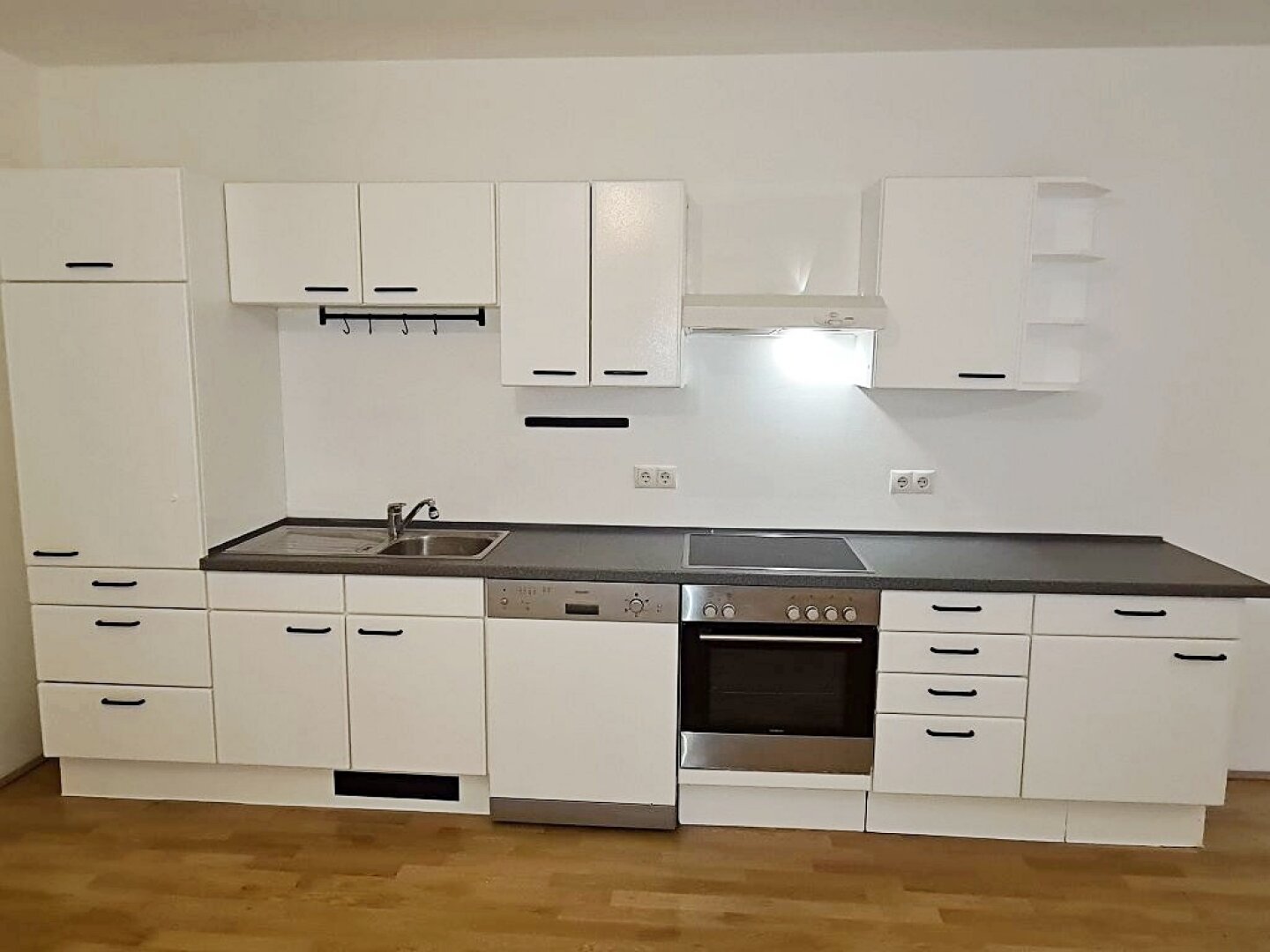 + Küche mit Herd, Dunstabzug, Spüle, Geschirrspüler, Kühlschrank und Kästen