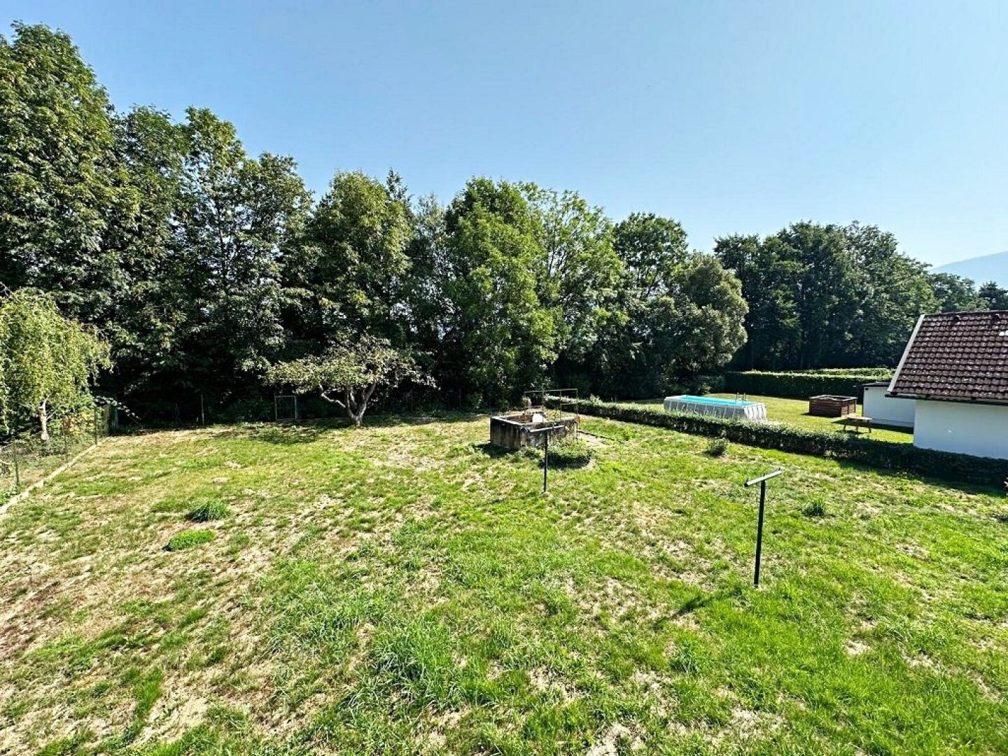 Der Garten ist begrünt und bietet ausreichend Platz, um der Kreativität freien Lauf zu lassen (Pool, Teich, Gemüsegarten, etc.). Der St. Thomaser Bach fließt an der nordöstlichen Grundstücksgrenze vorbei. Das Grundstück verfügt straßenseitig über ein Eingangstor sowie ein doppelflügeliges Einfahrtstor. Die Hauseinfahrt ist mit Platten verlegt.