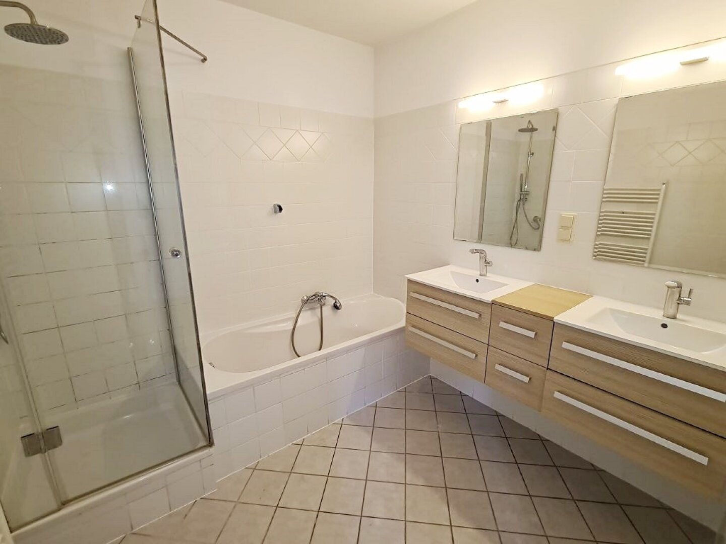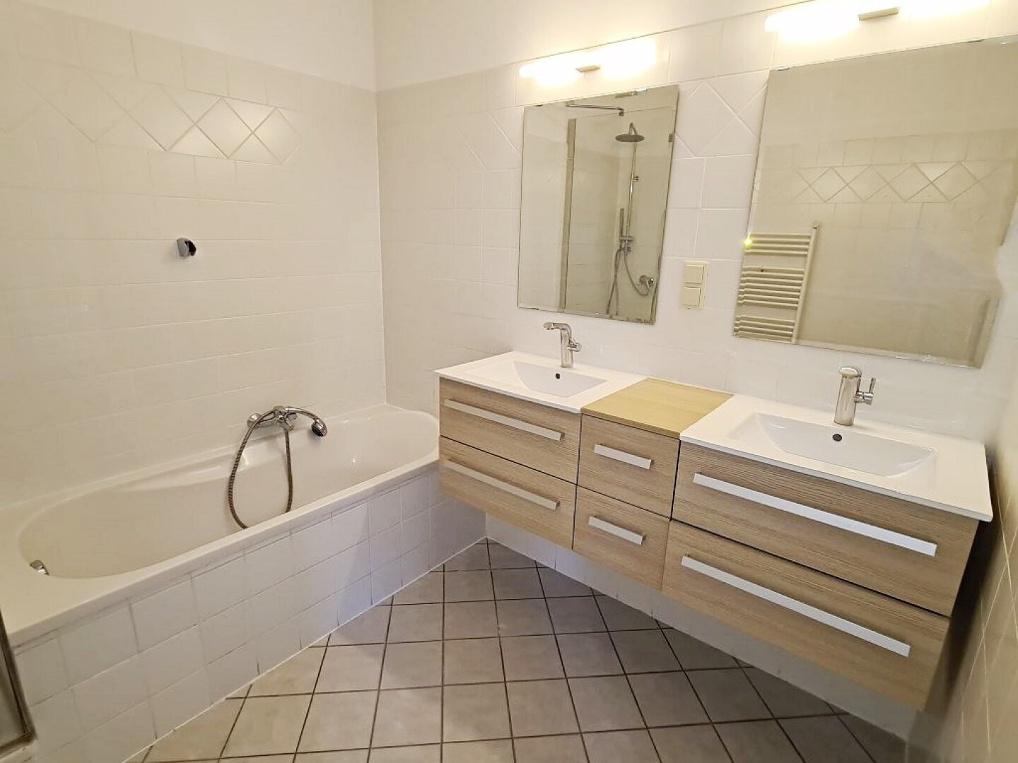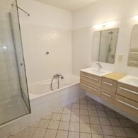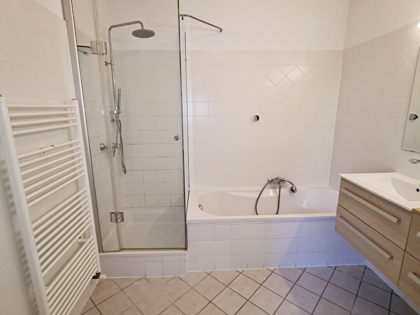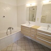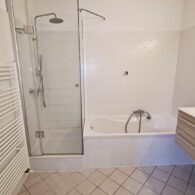 + Badezimmer mit Badewanne, Dusche, Waschtisch und Sprossenheizkörper