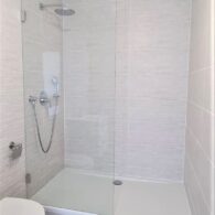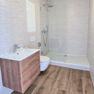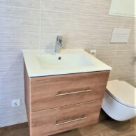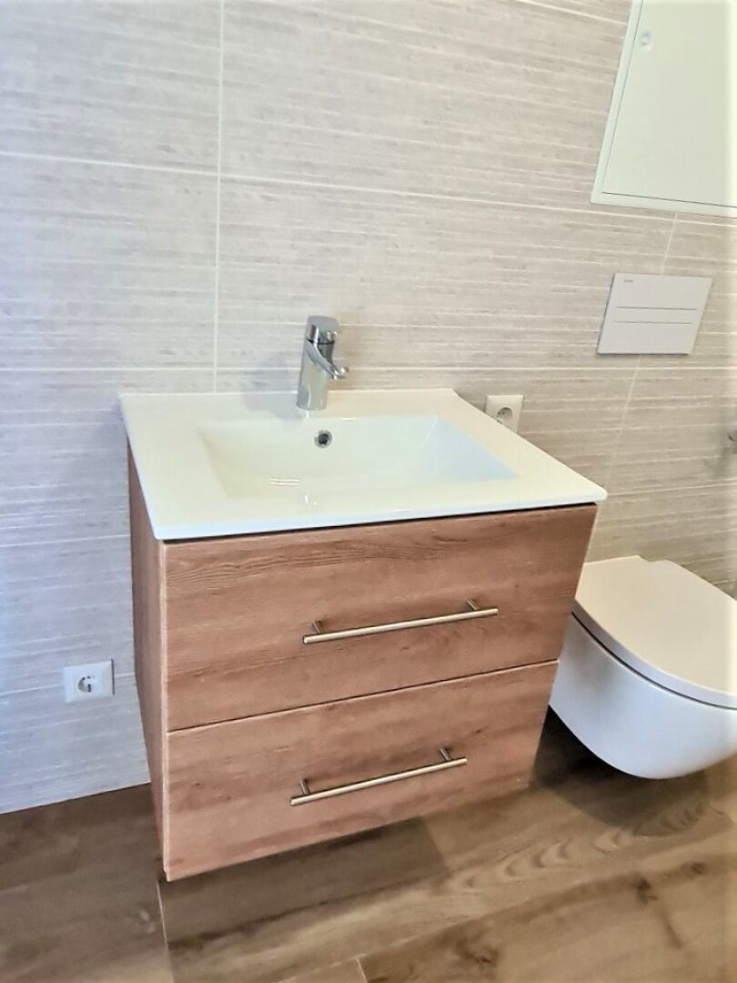 - Badezimmer mit Dusche, Waschtisch, WC und Waschmaschinenanschluss