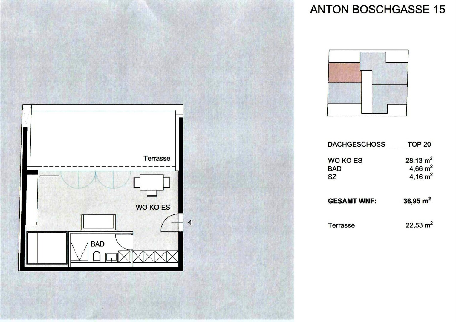 IN DER ANTON-BOSCH-GASSE GELANGT DIESE 36,95 m2 NEUBAUWOHNUNG MIT CA. 22,53 M2 TERRASSE IM DACHGESCHOSS ZUR BEFRISTETEN VERMIETUNG!