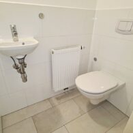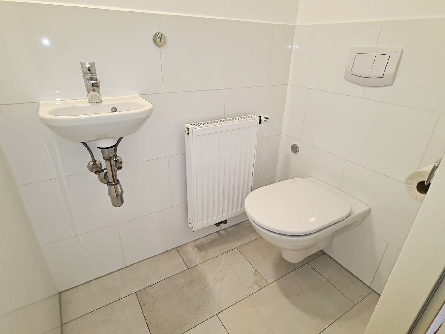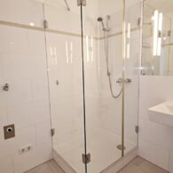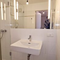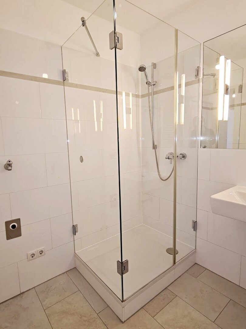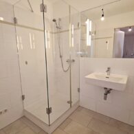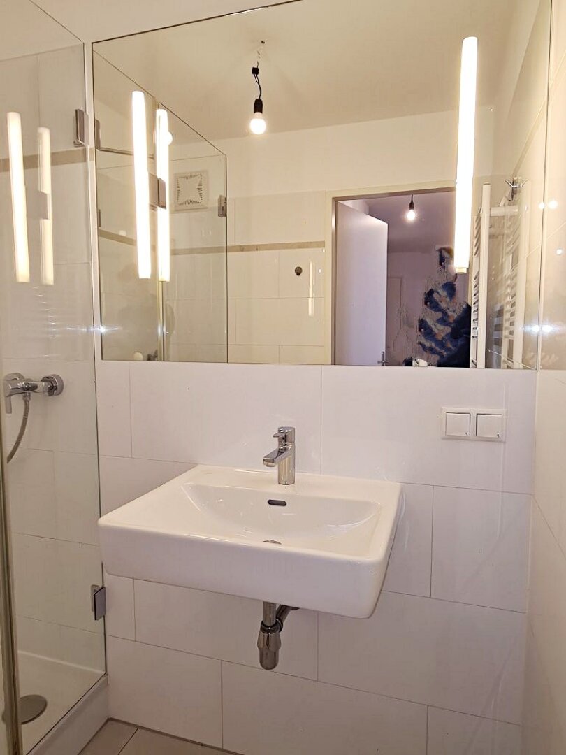 + Badezimmer mit Dusche, Waschtisch und Sprossenheizkörper