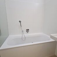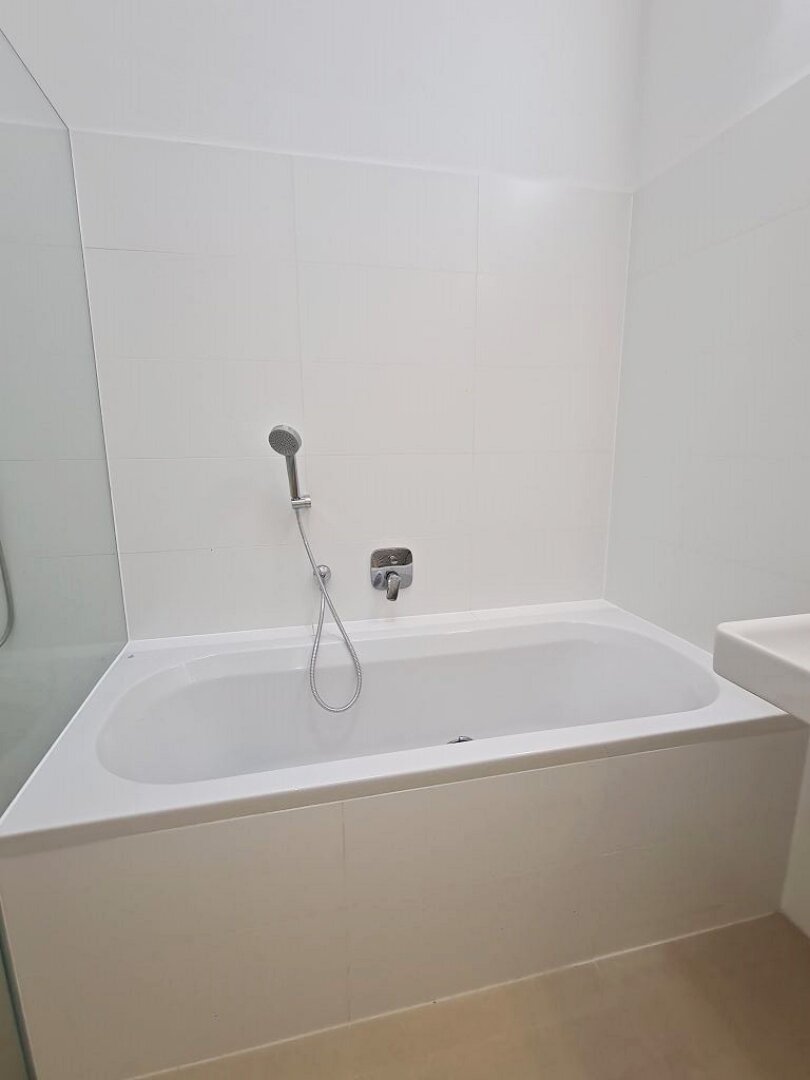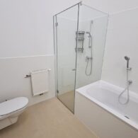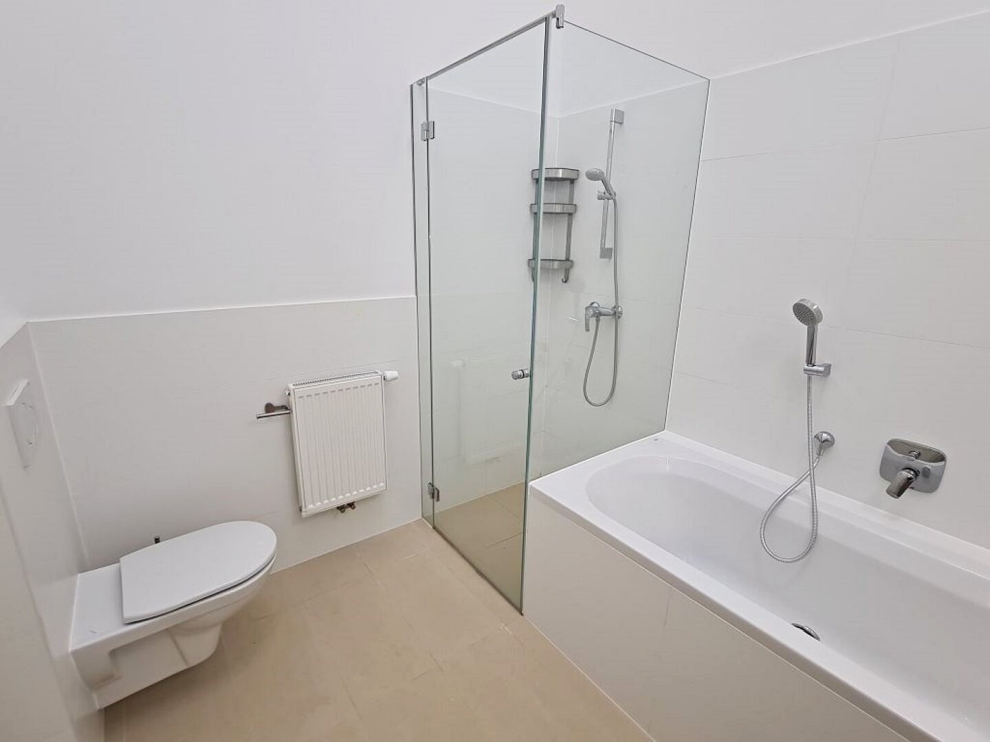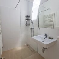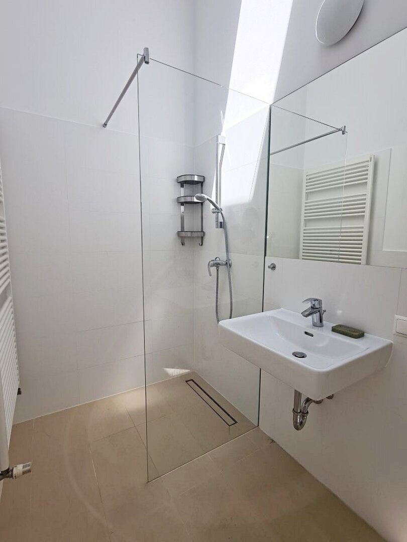 + Badezimmer mit Dusche, Waschtisch und Waschmaschinenanschluss